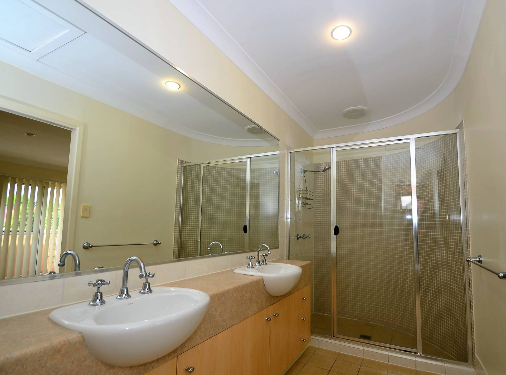 A polished timber staircase leads to three extra large bedrooms, the master - also with split system air conditioning -  providing extra wardrobe space and a  well appointed ensuite with twin basins, while the two huge guestrooms access a large bathroom with separate bath/shower.