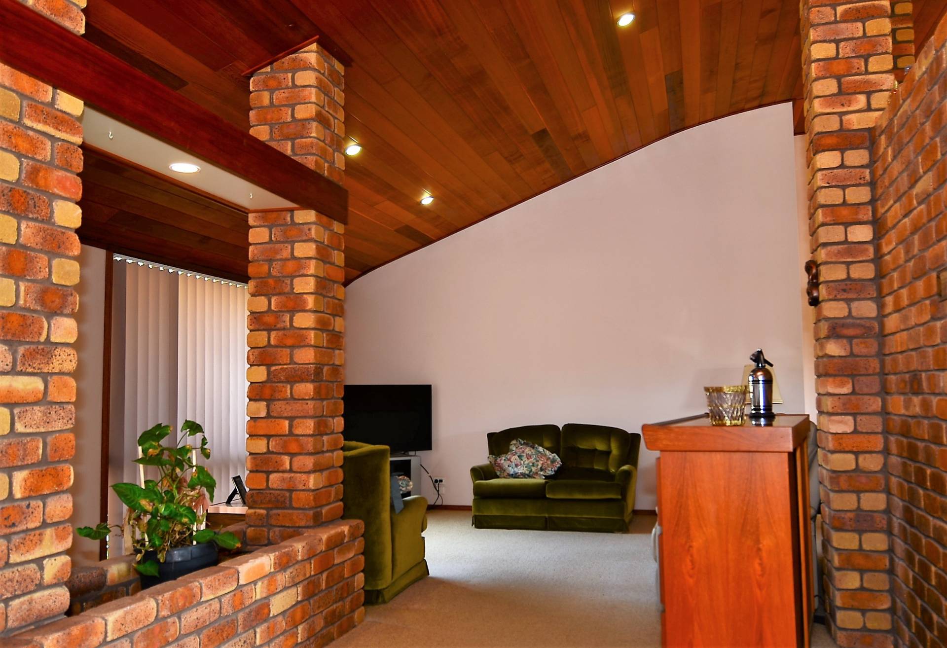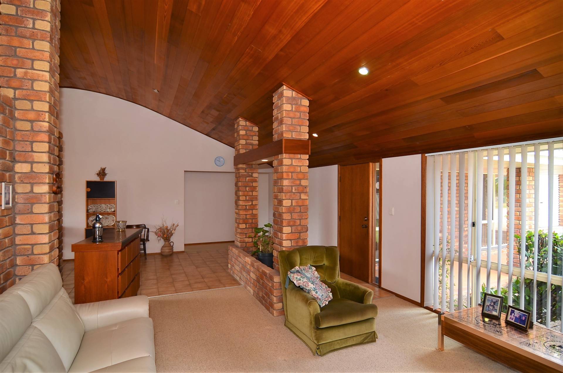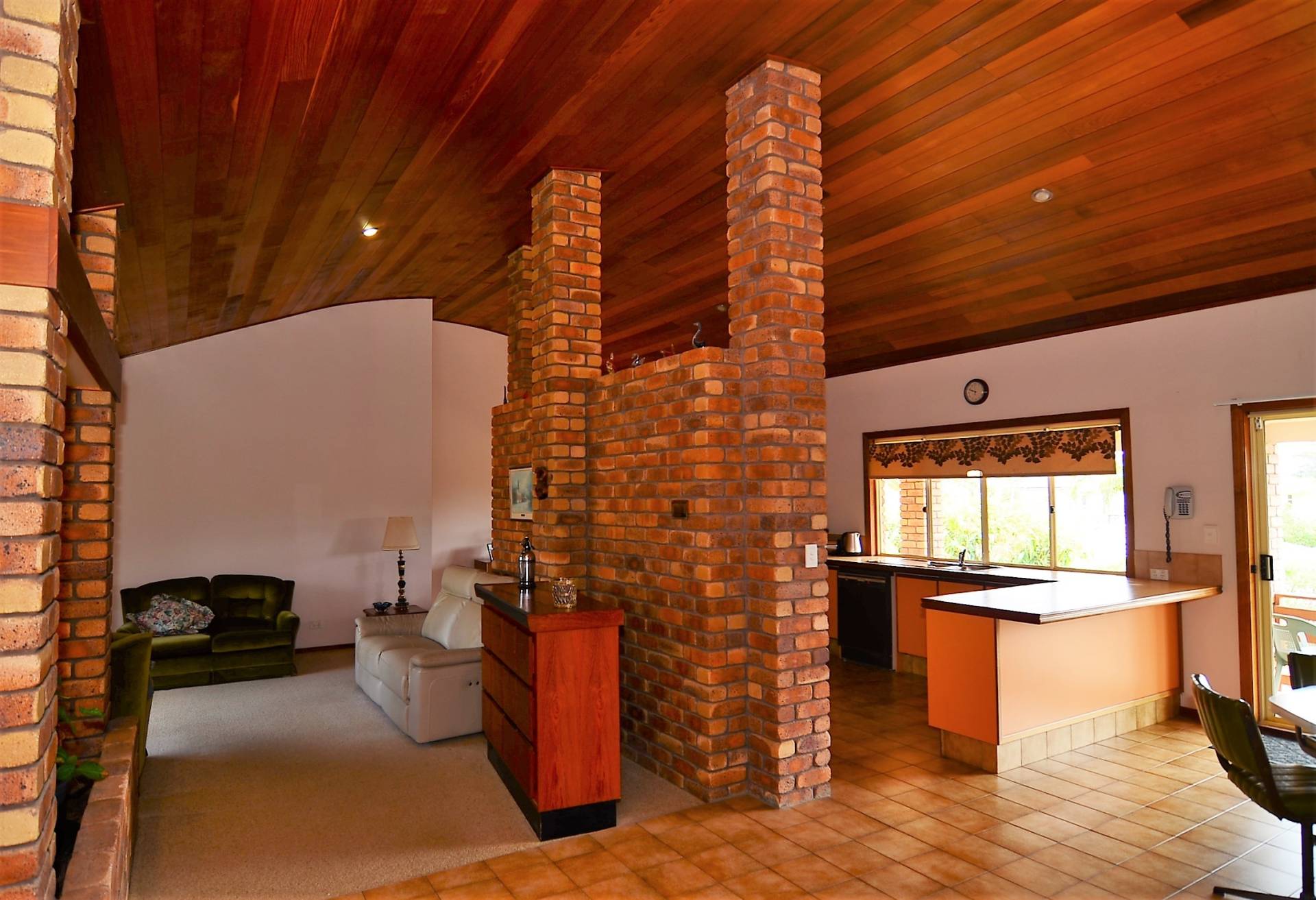 Built by a master craftsman, the living area is dominated by a domed cathedral ceiling in polished cedar, while the warmth of this home is further enhanced by the exposed brick pillars.   Open plan living, offering your choice of formal lounge, dining and casual living rooms, flow to an extensive under cover entertaining area.