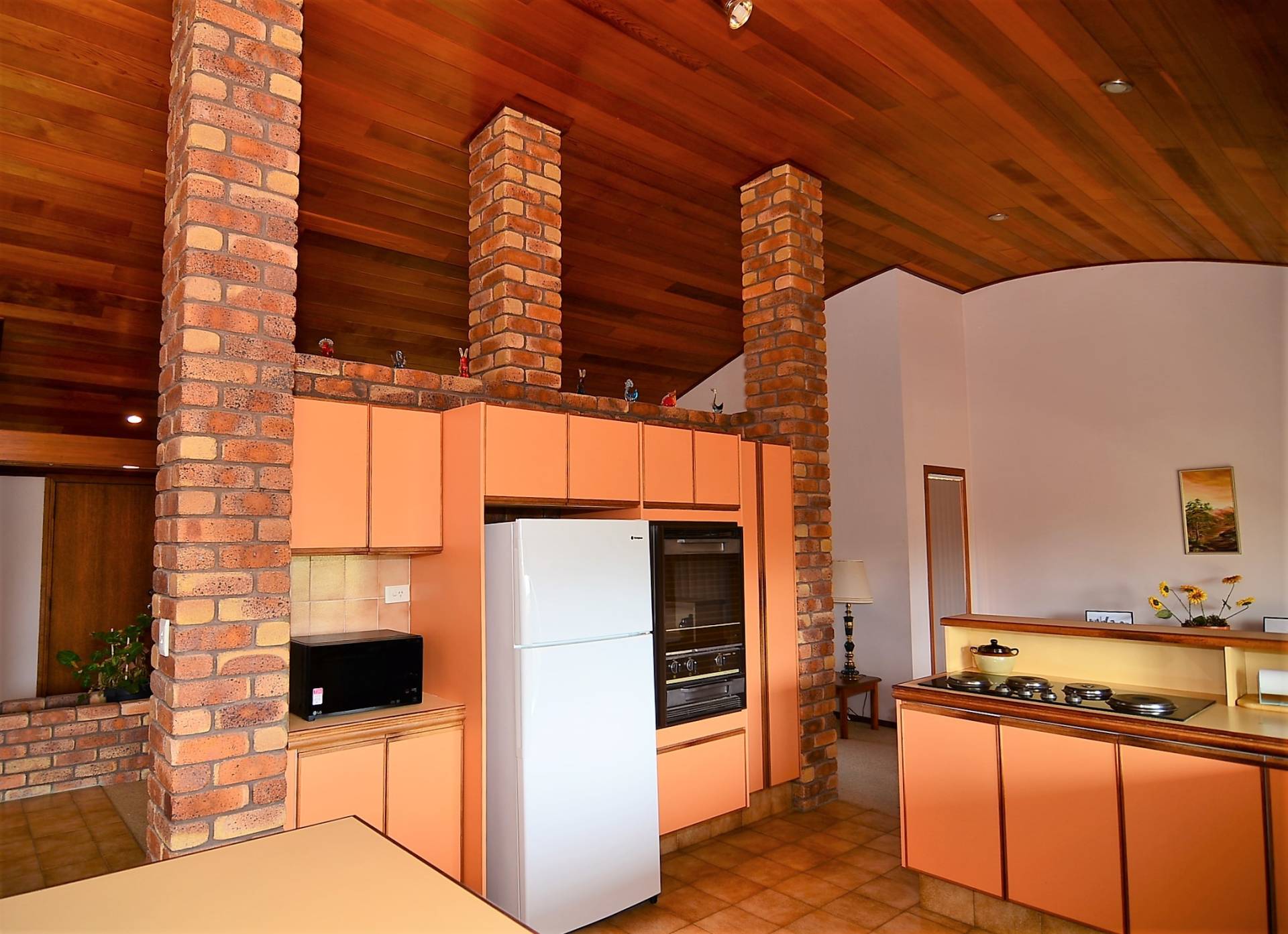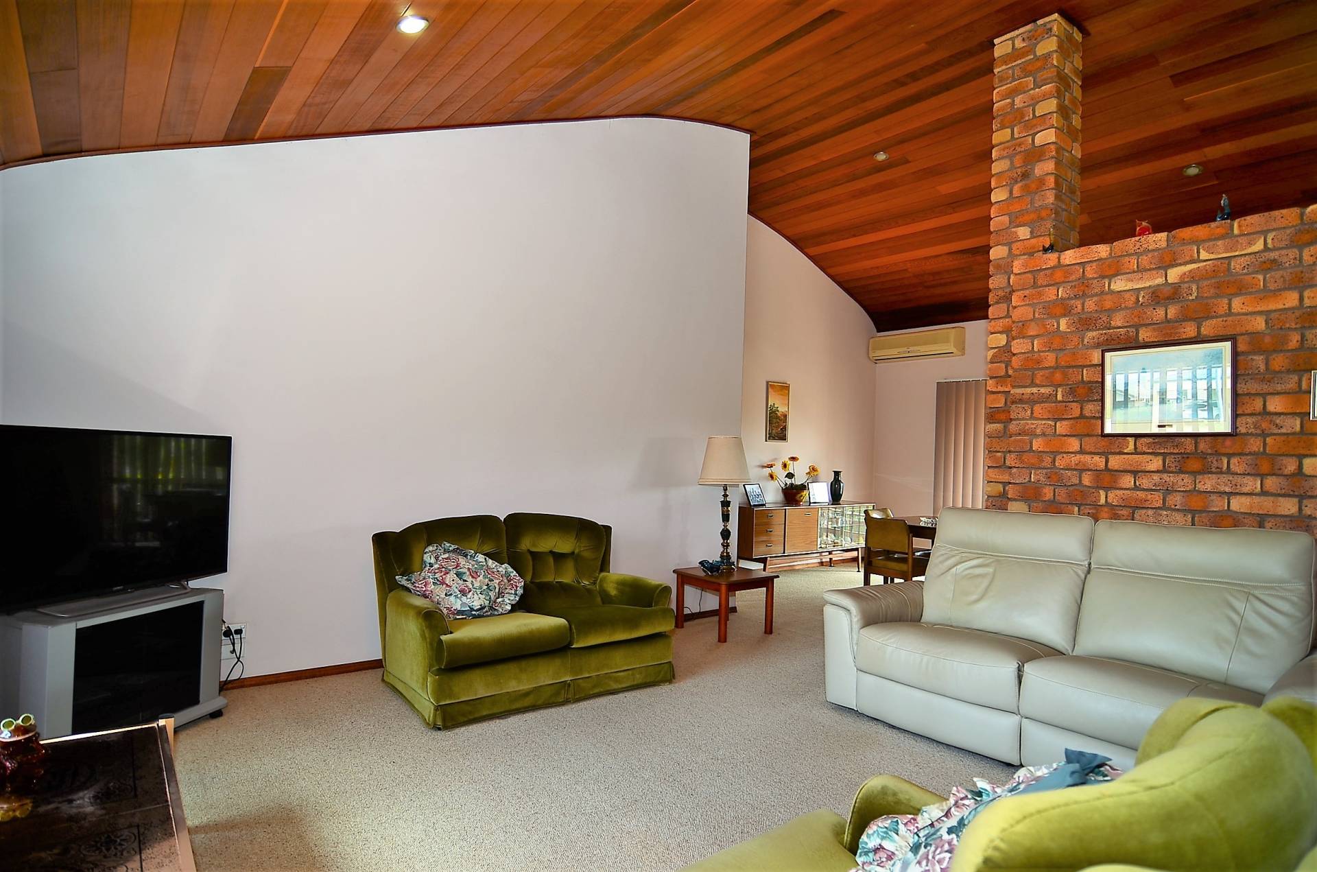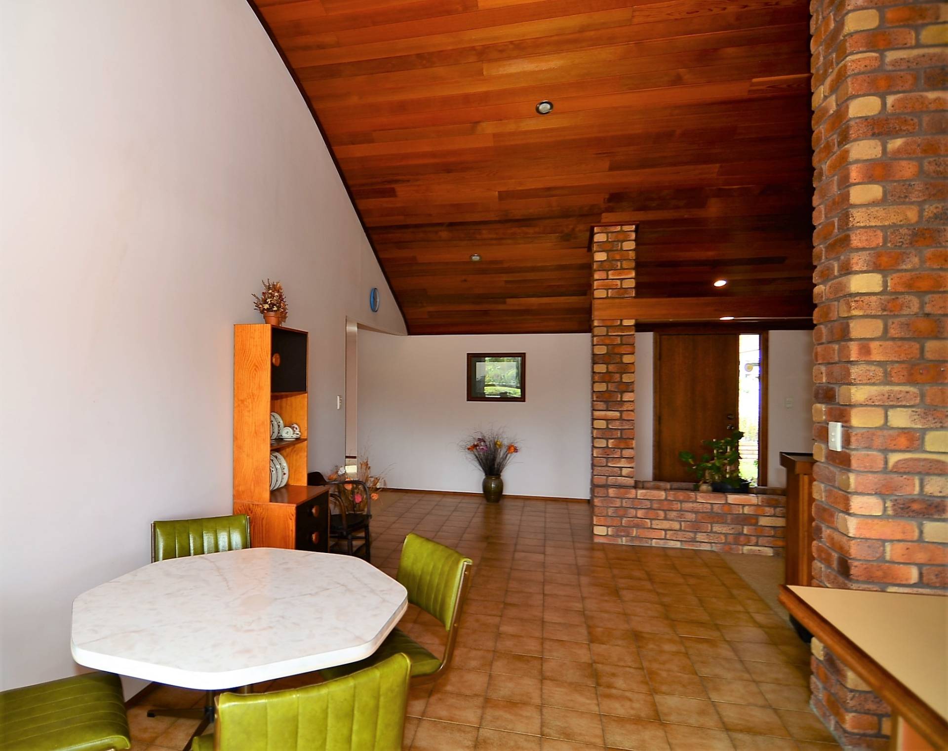 Built by a master craftsman, the living area is dominated by a domed cathedral ceiling in polished cedar, while the warmth of this home is further enhanced by the exposed brick pillars.   Open plan living, offering your choice of formal lounge, dining and casual living rooms, flow to an extensive under cover entertaining area.