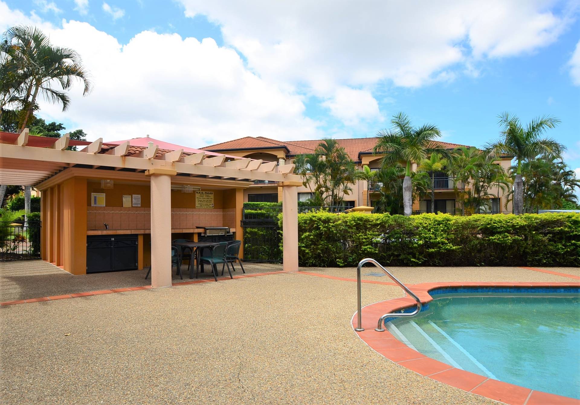 Body corporate is a very acceptable $90 p/w for a complex offering on site management, security gate entry and two  swimming pools.